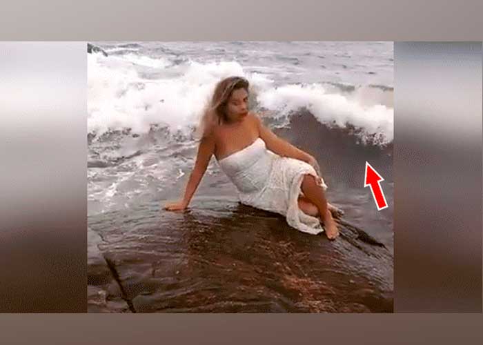La cámara que llevaba su amigo para grabar la sesión fotográfica pudo captar el momento exacto en que la joven es arrastrada por una gigantesca ola, tras presumir su belleza en atrevida pose. Sin embargo, su sensualidad se vio seriamente afectada por la fuerza de la naturaleza que la dejó en completo ridículo.
