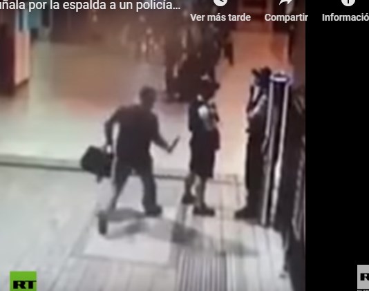 En el video se puede ver a dos policías dialogando en lo que aparenta ser una estación de micros. Todo transcurre en calma cuando en la filmación irrumpe un hombre con una mochila.