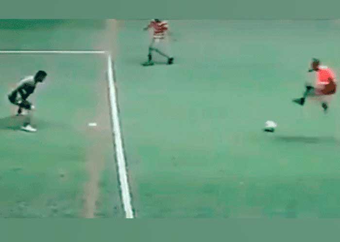 Resulta que el jugador de fútbol se encuentra trasladando el balón por la mitad del campo deportivo hasta que se ubica a unos metros del portero que promete custodiar con fiereza su arco; sin embargo, lo que nadie esperaba era que el goleador saltaría moviendo las piernas, tal como se distingue en Facebook.