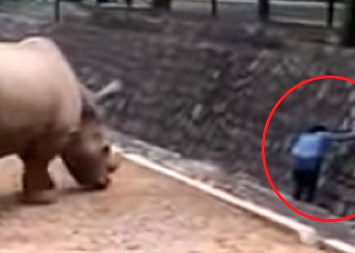 El hecho ocurrió la tarde del pasado 5 de mayo y como se puede ver en las imágenes, uno de los rinocerontes se le acercó cuando ella trataba de salir del foso.