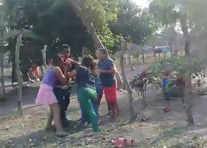Además de las dos mujeres que están de frente a la cámara, a distancia muy cercana están dos más jóvenes que se sostienen el pelo y también quieren, a como se dice popularmente en el buen nicaragüense, malmatarse. Se desconoce si estas serían familiares o amistades de las otras dos, lo cierto es que se zarandean y se dicen improperios con una gran descarga de violencia.