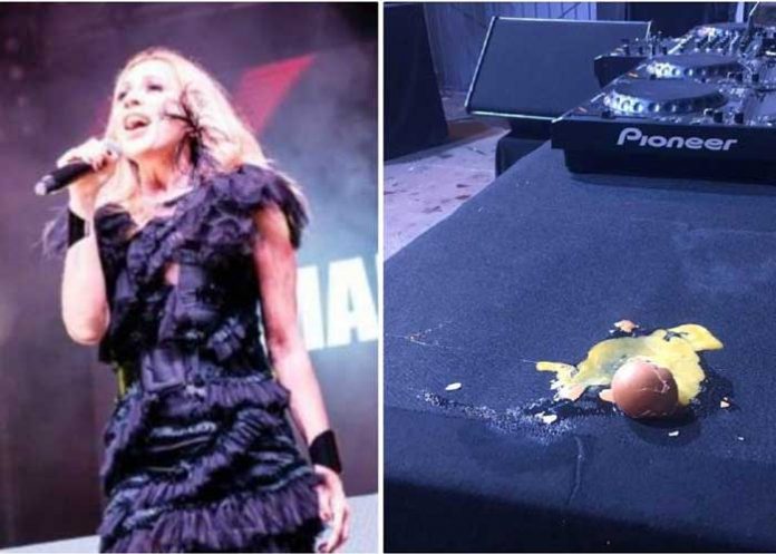 La artista madrileña, quien el pasado mes de febrero estrenó una versión con letra del himno de España, subió al escenario y apenas comenzó su actuación, tuvo que retirarse a consecuencia de la lluvia de huevos que recibió por parte del público.