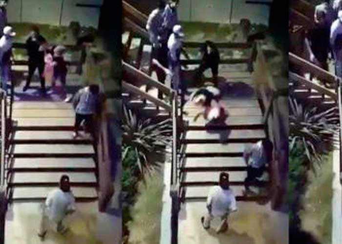 En ese momento, una mujer  según medios locales, la pareja del muchacho golpeado intentó pegarle al guardia, pero acaba siendo arrojada escaleras abajo por este.