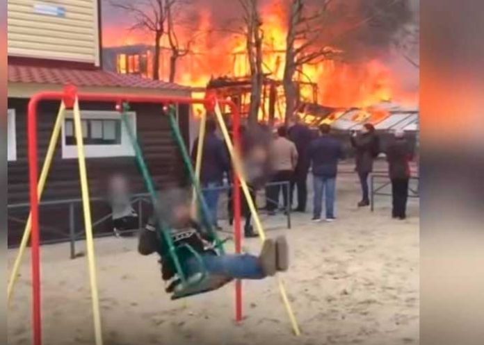 Como podrás apreciar en la grabación, el menor, quien vive en una pequeña ciudad del distrito de Yamalia-Nenetsia, en Rusia, se balancea imperturbable mientras las llamas devora una edificación ubicada a unas cuantas cuadras del patio en el que se encuentra.