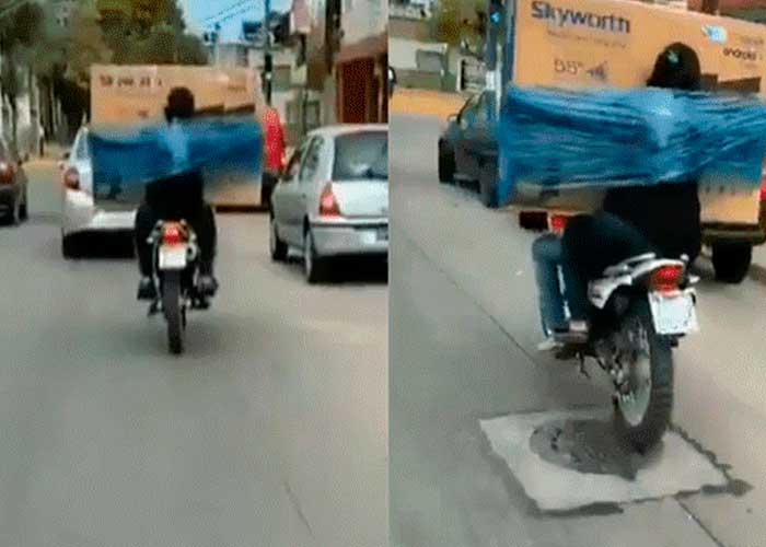 No se se hicieron problemas y buscaron una solución rápida y sencilla. Esto es lo que hizo una pareja que se ha hecho viral en Facebook, luego de que se difundiera un video que muestra el peculiar método que usó para trasladar un televisor de gran tamaño en una motocicleta, desde la tienda donde lo compraron hasta su casa.