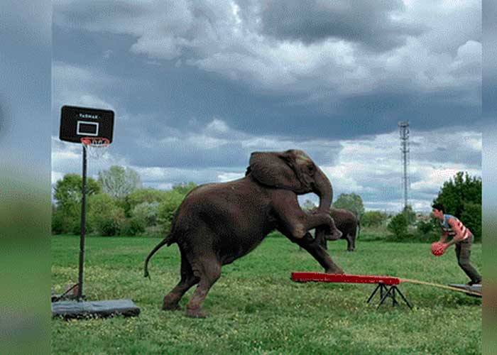 Como podrás apreciar en el video, que tiene 130 millones de reproducciones en Facebook, el primer truco fue sumamente peligroso y consistió en aprovechar la fuerza del elefante para salir despegado por los aires y encestar el balón en el aro de básquetbol.