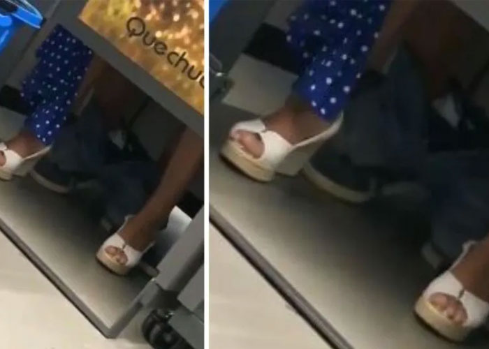 El vídeo está grabado desde el exterior de los probadores y se aprecian dos pares de piernas, unas de ellas con tacones y las otras con unas deportivas.