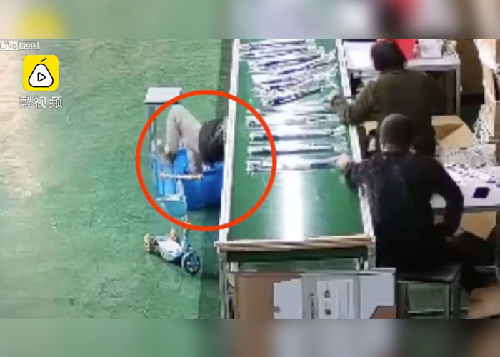 Los trabajadores del lugar (aparentemente en algún lugar de China) al momento de percatarse del accidente detienen rápidamente la maquinaria y llaman a las autoridades correspondientes para salvar la vida del menor.
