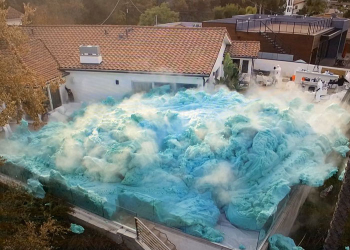 El equipo que participó en la experiencia se reunió en el patio de la casa de Dobrik, en California (EE.UU.)., y luego de poner todo en su lugar y mezclar adecuadamente todos los productos en un enorme recipiente, se produjo una enorme erupción masiva de espuma