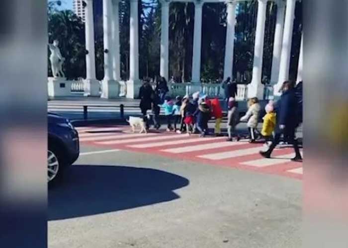 Una persona identificada como Beqa Tsinadze sacó su celular tras notar la cautivadora escena que después subió a Facebook. Entretanto, el perro acompañó a los alumnos y sus maestros hasta el otro lado de la calle para asegurarse que estén protegidos.