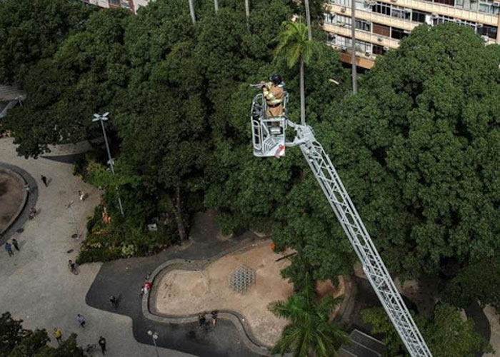 Antes de interpretar las canciones, se eleva unos 20 metros portando una bandera del país para poder llegar con su música a más familias en conjuntos habitacionales en barrios del norte y sur de la ciudad.