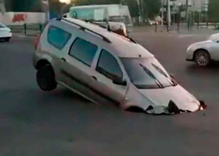 Una carretera en Astracán (Rusia) se 'tragó' un vehículo Lada. Aparentemente, el conductor no vio un enorme pozo en el camino y el auto quedó atrapado. El hombre resultó ileso. pic.twitter.com/mrHL3Y9KkN