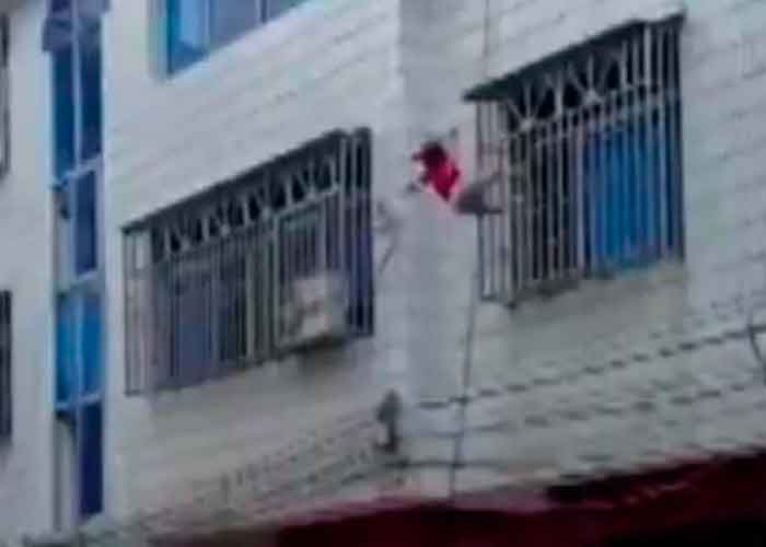 Imágenes grabadas en la provincia de Jiangxi, en China, muestran el dramático momento en el que una niña de cuatro años está a punto de morir y es salvada por un grupo de vecinos que logra actuar justo a tiempo después que la pequeña se cayera por la ventana de un edificio de tres pisos, informan medios locales.