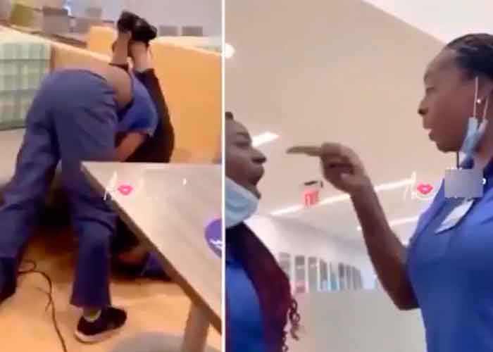 En las imágenes se puede ver a dos enfermeras, con sus cubrebocas alrededor de la barbilla, en una acalorada discusión en lo que parece ser un comedor del hospital, hasta que una de ellas empuja a la otra y se desata una pelea física.