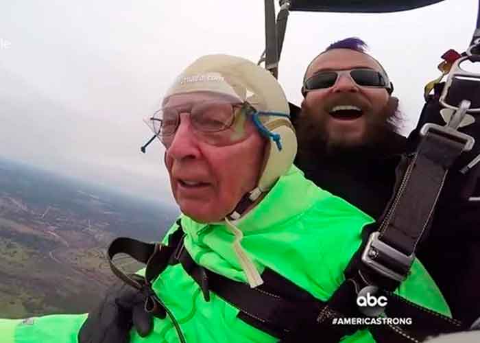 El abuelo de 103 años decidió saltar de un paracaídas para celebrar la graduación de la universidad de su nietos gemelos Kevin y Jason. Además, se le presentó la idea de batir el récord mundial de Guinness al convertirse en el paracaidista más longevo. El momento fue grabado por camarógrafos de la compañía de deportes extremos.