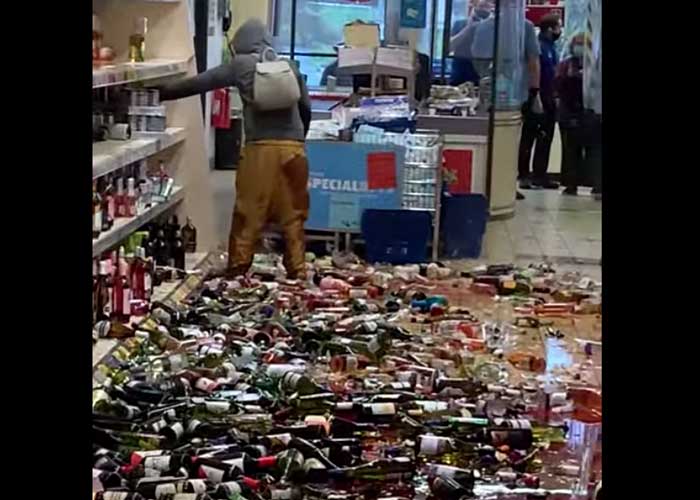 El video fue grabado el 25 de noviembre, y en él se aprecia a la mujer caminando entre botellas rotas mientras va arrojando más envases de los estantes. La persona incluso se cayó al resbalarse con los cristales rotos y se cortó las manos, pero continuó con su cometido.