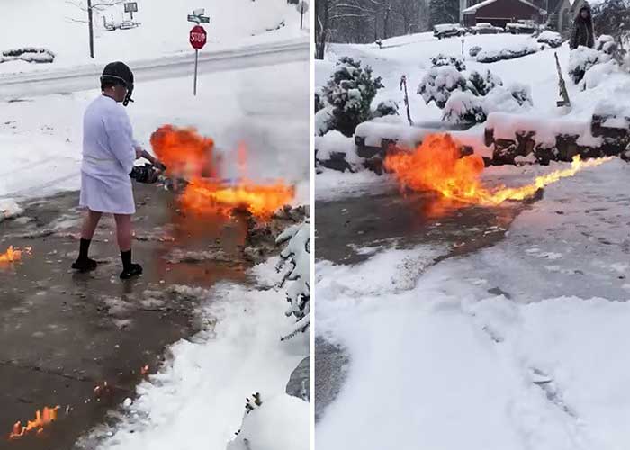 Timothy Browning, un vecino de Ashland (Kentucky, EE.UU.) echó mano de un lanzallamas para derretir de un plumazo los bancos de nieve acumulados durante los últimos días navideños en la entrada de su casa.