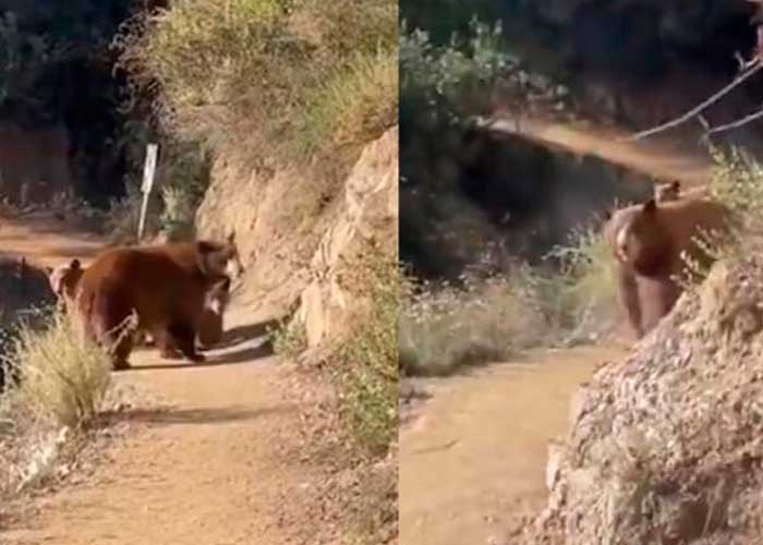 A runner had a chaotic encounter with a brown bear and its cubs during a hike in Sierra Madre, California. Video shows the hiker roaring and whistling at the wild animals in an attempt to scare them off. https://t.co/wW9BlO5yBs pic.twitter.com/MMfShGPCl7
