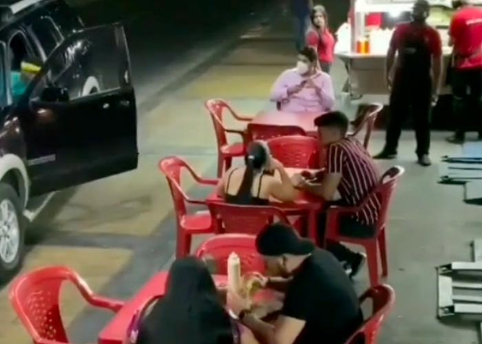 El video que fue capturado por las cámaras de seguridad y muestra el momento en que una muchacha llegó al lugar en una camioneta y descubrió a su esposo con la amante cenando en un puesto de hamburguesas callejeras; lo que generó de inmediato una fuerte discusión.