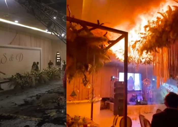 En las imágenes de los hechos ocurridos el pasado 17 de septiembre, se puede observar a la pareja bailando al centro de la pista al compás de ‘Para amarnos más’ de Mijares. De pronto la pirotecnia lanzada del escenario alcanza los adornos de follaje seco que cuelgan del techo.