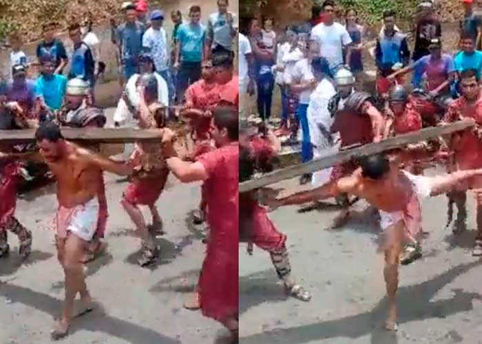 Resulta que sus compañeros le daban azotes muy fuertes durante su representación y ante los continuos golpes decidió defenderse a las patadas en pleno viacrucis a sus agresores. El video que se volvió viral en redes sociales causa mucho gracia, lo que para el sujeto que recibía los azotes no fue nada gracioso.