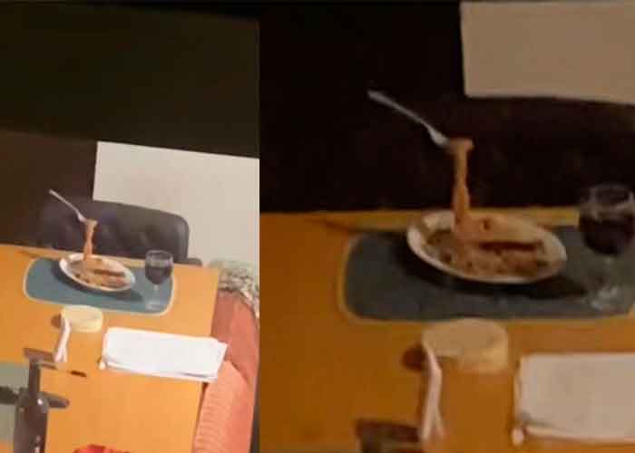 En el clip se puede escuchar la sorpresa de la tiktokers, quien por accidente descubrió que su vecino que aparentemente cenaba, estaba acompañado de un fantasma; ya que en la escena se puede observar un plato flotante con espagueti y una copa de vino.