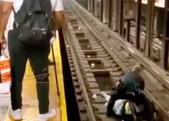 Un hombre que se desmayó y cayó sobre las vías del metro en la ciudad de Nueva York fue rescatado por un oficial de policía y un buen samaritano; momentos antes de que llegara un tren subterráneo a la estación.