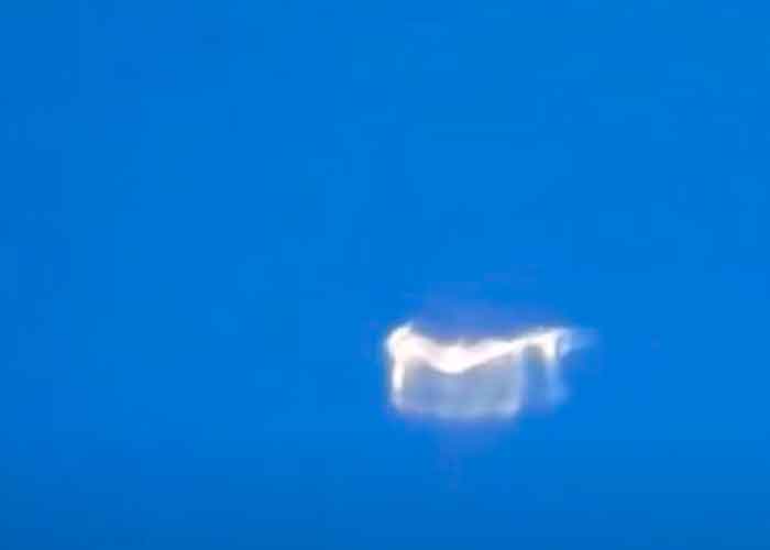 En el clip se ve un objeto iluminado blanco volando a una altitud mayor que el avión. El contorno del objeto parece ser un dron o una forma plana, pero pronto comienza a «transformarse» y se alarga.