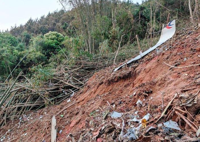Los medios estatales de China mostraron equipos de rescate uniformados trepando por el terreno zarandeado por la caída del avión, entre árboles arrancados y escombros de la nave; entre ellos una parte del aparato con el emblema rozo y azul de la aerolínea.