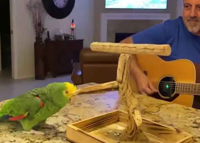 Foto: Loro canta rock clásico con acompañamiento de guitarra /Captura